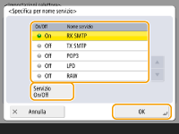 Premere <Specifica per nome servizio> per utilizzare i nomi dei servizi quando si specificano le porte a cui si applica l'IPSec. Selezionare il servizio nell'elenco, premere <Servizio On/Off> per impostarlo su <On> e premere <OK>.
