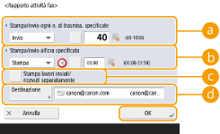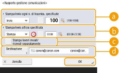 Per documenti inviati per posta elettronica, l'elenco indica i risultati dell'invio tra la macchina e il server della posta, non tra la macchina e la destinazione. Se si seleziona <Generaz. ogni n. trasm. specif.> nella fase 3, si può specificare il numero di risultati di registro che compaiono nell'elenco. È possibile specificare se stampare l'elenco automaticamente o meno. |