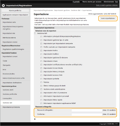 Viene richiesta la password in [Password crittografia] ogni volta che vengono importati i dati di impostazione esportati. Utilizzare caratteri alfanumerici.