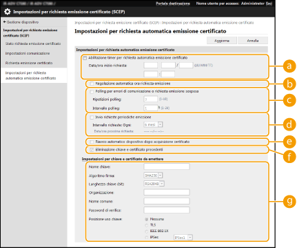 [Invio richieste periodiche emissione]Selezionare questa opzione per inviare periodicamente una richiesta automatica di emissione di un certificato e specificare l'intervallo in [Intervallo richieste: Ogni:].