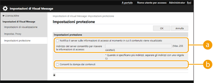 Fare clic su [Licenza/Altro] [Impostazioni di Visual Message]  [Impostazioni protezione].