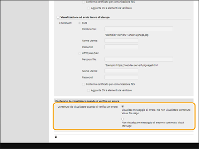 Specificare le impostazioni proxy nella funzione Visual Message in modo che corrispondano alle impostazioni in <Impostazioni Proxy>. Se è stato impostato un proxy, il contenuto specificato potrebbe non essere visualizzato. In questo caso, impostare un’eccezione per indirizzo in modo che il server proxy non venga utilizzato.
