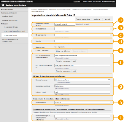 Per specificare una Active Directory, una Microsoft Entra ID o un server LDAP come dispositivo di autenticazione aggiuntivo, è necessario registrare le informazioni del server utilizzate per l'autenticazione. Se necessario, eseguire un test di connessione.