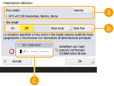 <Ora legale>Per impostare l'ora legale, premere <On> e impostare la data e l'ora per <Data inizio> e <Data fine>. Per impostare la data, specificare il giorno della settimana e la settimana del mese.