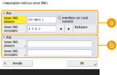 Premere <Server DNS primario> e inserire un indirizzo IPv4 del server DNS.