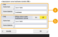 Per impostare il nome host e il nome di dominio affinché siano gli stessi di IPv4, premere <On> in <Utilizzo stesso nome host/dominio di IPv4>. Per impostarli in modo che siano diversi da quelli di IPv4, premere <Off>.