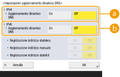 Impostare su <On> l'indirizzo da registrare come server DNS in <Registrazione indirizzo stateless>/<Registrazione indirizzo manuale>/<Registrazione indirizzo stateful>. L'aggiornamento automatico non può essere eseguito se tutti i valori sono impostati su <Off>.