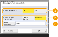 Per usare la community selezionata, premere <On>. Se non si vuole usare la community, premere <Off>.