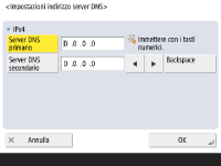 Premere <Preferenze>  <Rete>  <Impostazioni linea secondaria>  <Impostazioni per Comunicazione dati di sistema>  <Impostazioni indirizzo server DNS>.