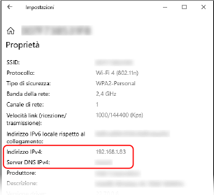 In [Proprietà], visualizzare l’indirizzo IP e il server DNS.
