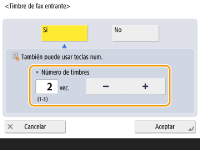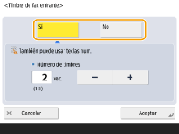 <Volumen timbre entrante>Pulse para ajustar el volumen de los faxes entrantes cuando <Modo de RX> esté ajustado en <Fax/tel (cambio aut.)>. Para silenciar el sonido, pulse