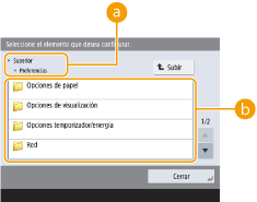 (Config./Guardar) para ver la pantalla <Configuración>. Pulse esta tecla en primer lugar para realizar cambios para cada opción, como pueden ser la configuración del papel, los ajustes de la pantalla y las opciones de red. En esta pantalla, también podrá registrar destinos, por ejemplo direcciones de correo electrónico y números de fax.