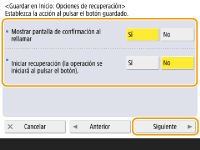 Si selecciona <Sí> para <Iniciar recuperación (la operación se iniciará al pulsar el botón).>, la copia se iniciará cuando pulse el botón registrado sin pulsar  (Inicio). Seleccione <No> si desea iniciar la copia manualmente pulsando  (Inicio).