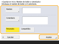 Introduzca el nombre del botón y un comentario, seleccione <Personales> o <Compartidos>, y pulse <Aceptar>.
