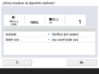 Si selecciona <Sí> para <Mostrar pantalla de confirmación al rellamar> y <Iniciar recuperación (la operación se iniciará al pulsar el botón).>, la copia se iniciará cuando seleccione <Sí> en la pantalla de confirmación.