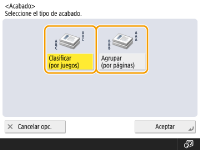 Si pulsa <Opciones>  <Formar trabajo> en la pantalla de funciones básicas de copia, podrá utilizar la función Clasificar/Agrupar aunque el original esté colocado en el cristal de la platina.