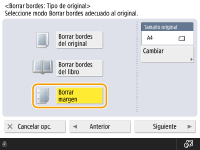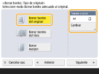 1 | Pulse <Borrar bordes del original> y establezca <Tamaño original>. ![]() Si el tamaño que aparece en <Tamaño original> es distinto al del original que ha configurado, pulse <Cambiar> para seleccionar el tamaño. |