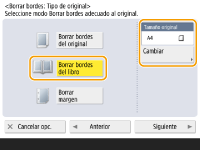1 | Pulse <Borrar bordes del libro> y confirme <Tamaño original>. ![]() Si el tamaño que aparece en <Tamaño original> es distinto del libro que ha configurado, pulse <Cambiar> para seleccionar el tamaño. |