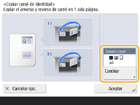 Si hay otro original en el alimentador, no se puede iniciar la copia. Retire el original del alimentador. Puede utilizarse papel de tamaño LTR/A4 para <Copiar carné de identidad>. |