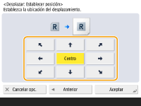 Pulse <Establecer> en <Anverso> y especifique la distancia de movimiento. Pulse los botones arriba/abajo/izquierda/derecha para indicar las direcciones e introduzca la distancia de movimiento con las teclas numéricas.