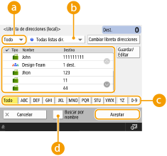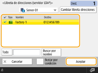 <Guardar nuevo dest.>, <Detalles/Editar> y <Eliminar> en <Guardar/Editar> en la pantalla Libreta de direcciones (local) pueden utilizarse para registrar nuevos destinos, comprobar detalles y editar/eliminar destinos. Para utilizar la libreta de direcciones remotas, es necesario configurar los ajustes del equipo servidor. Establezca en abierto la libreta de direcciones remota de forma externa en el equipo servidor. |