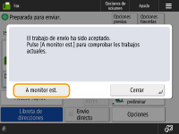 Comprobar el número total de destinos especificadosEn la parte superior derecha de la pantalla se muestra el número total de destinos especificados. Esto le permite confirmar antes de proceder al envío que el número de destinos es correcto. ![]() Para enviar con la información del remitentePuede enviar con el nombre y el número de fax del remitente. <ID de terminal TX> Para consultar los estados de los documentos enviadosEn la pantalla <Monitor estado>, puede consultar los estados de los documentos enviados. En esta pantalla puede volver a enviar faxes o cancelar el envío tras consultar los estados. Comprobación del estado y el registro de los documentos enviados y recibidos Cuando <Mostrar notificación cuando se acepta el trabajo> está establecido en <Sí>, la pantalla <Monitor estado> puede mostrarse desde la siguiente pantalla mostrada tras la recepción de un trabajo enviado.<Mostrar notificación cuando se acepta el trabajo> ![]() Si se produce un error de transmisión porque la línea del destinatario comunicaEl equipo vuelve a marcar automáticamente tras un cierto período de tiempo. Puede cambiar la configuración relativa a cuántas veces vuelve a marcar el equipo y al intervalo entre marcaciones. <Remarcación auto> Para imprimir el informe de los resultados del envíoEn la pantalla de funciones básicas de fax, al pulsar <Opciones> <Informe result. de TX>, podrá configurar que se imprima automáticamente el informe con la lista de resultados del envío.Para establecer esto para cada trabajo en <Opciones>, es necesario seleccionar <Sólo en caso de error> o <No> en <Informe result. de TX> y, a continuación, configurar <Permitir impresión desde opciones> en <Sí>. Cuando las fotos de la imagen enviada son demasiado oscuras o tienen colores claros en el fondo de color, los originales no pueden eliminarseLa calidad de la imagen enviada puede mejorarse si se cumplen las siguientes condiciones y ajustes. Tipo de trabajo: Fax (Envío desde memoria) o Leer y Enviar (Fax/I-fax) <Selección color>: <Blanco y negro> (Leer y Enviar) <Tipo de original>: <Texto> <Densidad> <Densidad del fondo>: <Auto><Resolución>: 200 ppp x 400 ppp, 300 ppp x 300 ppp*, 400 ppp x 400 ppp o 600 ppp x 600 ppp* * Puede establecerse para Leer y enviar <Priorizar vel./calidad de imagen para lectura en B/N> Trabajos de envío por fax/I-fax: <Priorizar calidad> (<Priorizar vel./calidad de imagen para lectura en B/N>) |