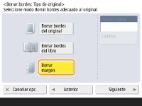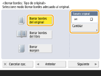 <Borrar bordes>.1 | Pulse <Borrar bordes del original> y consulte <Tamaño original>. ![]() Si el tamaño que aparece en <Tamaño original> es distinto al tamaño del original, pulse <Cambiar> para seleccionar el tamaño. Solo puede establecer el modo Borrar marco original para los tamaños originales mostrados en la pantalla del panel táctil. |