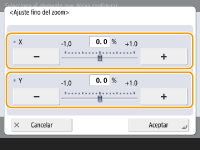 Si el tamaño de la imagen copiada es ligeramente distinto al de la imagen original, siga el siguiente procedimiento para realizar un ajuste fino de su tamaño. Puede ajustar el aumento de los anchos horizontal y vertical, respectivamente.