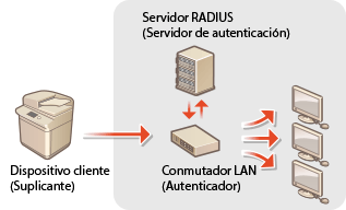 En un entorno de red que utiliza la autenticación IEEE 802.1X, el acceso no autorizado a la red es bloqueado por un conmutador LAN (autenticador) que solo permite el acceso administrador o dispositivos cliente (solicitantes) que están autorizados por el servidor de autenticación (servidor RADIUS). Para conectar esta máquina a una red IEEE 802.1X, es necesario configurar en el equipo ajustes como el de método de autenticación utilizado por el servidor de autenticación. Se requieren privilegios de administrador o NetworkAdmin para configurar estos ajustes. <Opciones de IEEE 802.1X> existe tanto para la línea principal como para la línea secundaria. Registre los ajustes según sea necesario.