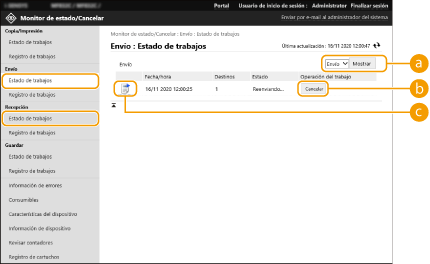 Inicie la IU remota  [Monitor de estado/Cancelar]  [Estado de trabajos] en [Envío] o [Recepción]