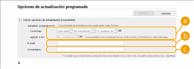 Seleccione la casilla de verificación para [Activar opciones de actualización programada] y configure las opciones necesarias.