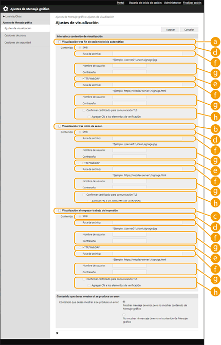 Especifique en la función Mensaje gráfico las mismas opciones de proxy configuradas en <Opciones de proxy>. Si se configura un proxy, es posible que el contenido especificado no aparezca. Si esto ocurre, configure una dirección excluida para que el servidor proxy no se utilice.