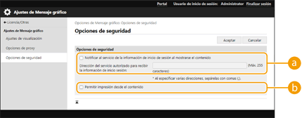 Haga clic en [Licencias/Otros] [Ajustes de Mensaje gráfico]  [Opciones de seguridad].