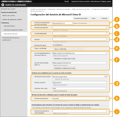 Para especificar un servidor Active Directory, Microsoft Entra ID o LDAP como dispositivo de autenticación adicional, deberá registrar la información del servidor empleado para autenticación. Si fuera preciso, lleve a cabo una prueba de conexión.