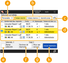 En esta pantalla podrá imprimir documentos retenidos, documentos de impresión segura o documentos de impresión segura cifrada. Podrá comprobar el contenido de dichos documentos o de los documentos de impresión programada o cambiar las opciones de impresión.