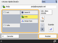 Para seleccionar un destino en la pantalla <Acceso rápido> después de escanear, configure <Acceso rápido> para <Pantalla prefijada>. Se puede reducir la tarea necesaria para enviar documentos digitalizados al mismo destino. <Pantalla prefijada> Los destinos registrados en los botones de acceso directo del equipo servidor se actualizan en los siguientes momentos: Cuando se ha enviado un trabajo de fax en el equipo cliente Cuando pulsa (Restaurar) en el equipo clienteCuando se activa el Reinicio automático en el equipo cliente |