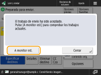 Comprobar el número total de destinos especificadosEn la parte superior derecha de la pantalla se muestra el número total de destinos especificados. Esto le permite confirmar antes de proceder al envío que el número de destinos es correcto. ![]() Para cancelar inmediatamente un trabajo que se está enviandoSi pulsa (Detener) en el panel de control mientras se está enviando un trabajo, aparecerá el mensaje <¿Desea cancelar el siguiente trabajo de envío?>. Pulse <Sí> para cancelar el envío.Puede seleccionar <Último trabajo recibido> o <Trabajo que se está enviando> seleccionar el trabajo que desea cancelar. <Trabajo que se cancelará al pulsar Detener> Pulse (Detener) cuando haya varios trabajos de envío que mostrar en la pantalla para seleccionar el trabajo de envío que desea cancelar. Si no se muestra el trabajo de envío que desea cancelar, pulse <Compruebe otros trab.> para mostrar <Trabajos de envío>. Seleccione el trabajo que desea cancelar y pulse <Cancelar>.Para consultar los estados de los documentos enviados/guardadosEn la pantalla <Monitor estado>, puede consultar los estados de los documentos enviados. En esta pantalla puede volver a enviar/guardar faxes o cancelar el envío/guardado tras consultar los estados. Comprobar el estado y el registro de los documentos escaneados Cuando <Mostrar notificación cuando se acepta el trabajo> está establecido en <Sí>, la pantalla <Monitor estado> puede mostrarse desde la siguiente pantalla mostrada tras la recepción de un trabajo enviado.<Mostrar notificación cuando se acepta el trabajo> ![]() Para imprimir el informe de los resultados del envío/guardadoEn la pantalla de Funciones básicas de lectura, al pulsar <Opciones> <Informe result. de TX> puede configurar que se imprima automáticamente el informe con la lista de resultados del envío/guardado.Para establecer esto para cada trabajo en <Opciones>, es necesario seleccionar <Sólo en caso de error> o <No> en <Informe result. de TX> y, a continuación, configurar <Permitir impresión desde opciones> en <Sí>. Nombre de archivoCuando se envía/guarda un archivo, el nombre de archivo se establece automáticamente según el formato siguiente. Puede cambiar la configuración para poder asignar un nombre. Configuración de un nombre de archivo Al enviar por correo electrónico "Números de trabajo (cuatro dígitos)_números de página (tres dígitos).nombre de extensión de archivo", como "1042_001.jpg" Al guardar en un servidor de archivos "El año, mes, día, hora, minuto y segundo en que se guarda el archivo (14 dígitos).nombre de extensión de archivo", como "20151030133541.jpg" Asunto del correo electrónicoEl asunto introducido en <Asunto prefijado> se establece automáticamente (<Asunto prefijado>). Si especifica un asunto distinto, cambie la opción o especifíquelo cada vez que envíe un correo electrónico (Especificación de las opciones de correo electrónico). |