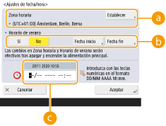 Para configurar el horario de verano, pulse <Sí> y ajuste la fecha/hora de <Fecha inicio> y <Fecha fin>. Para configurar la fecha, indique el día de la semana y la semana del mes.