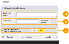 3 | Introduzca el nombre de usuario y la contraseña y configure las opciones necesarias. ![]() <Nombre de usuario>Escriba el nombre de usuario del equipo registrado en el servidor LDAP. ![]() Introducir el formato del nombre de usuario Si utiliza Windows Server, introduzca en el formato "(nombre de dominio de Windows)/(nombre de usuario de Windows)". Ejemplo: Si el nombre de dominio de Windows es "ejemplo" y el nombre de usuario de Windows es "usuario1", introduzca "ejemplo/usuario1". Si utiliza Lotus Notes Domino, introduzca el nombre de identificación de usuario autenticado (dn), como "cn=user1,ou=team1,ou=salesdept,o=canon". <Contraseña>Introduzca la contraseña registrada en el servidor LDAP. Una vez introducida la contraseña, aparecerá <Confirmar> para pedir confirmación. Vuelva a introducir la contraseña. <Mostrar pantalla de autenticación al buscar>Al buscar destinos, para ver la pantalla de introducción del nombre de usuario y la contraseña, pulse <Sí>. |