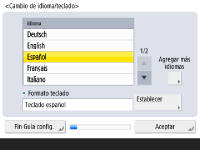 Seleccione el idioma que debe aparecer en las pantallas. En función del idioma, puede cambiar la disposición del teclado que aparece para introducir caracteres. ![]() ![]() Seleccione el idioma y pulse <Aceptar>. Para cambiar la disposición del teclado, pulse <Establecer>, seleccione la disposición del teclado y pulse <Aceptar>. Mostrar el botón para cambiar el idioma resulta práctico si se hace con frecuencia. Cambio del idioma de visualización | |