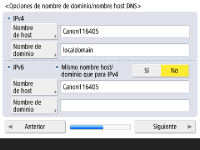 Especifique la dirección del servidor DNS, el nombre del host DNS y el nombre del dominio DNS. ![]() ![]() Pulse <Servidor DNS primario> y <Servidor DNS secundario>, introduzca la dirección IPV4/IPv6 para el servidor DNS y pulse <Siguiente>. Para obtener información sobre las opciones de la dirección del servidor DNS, consulte Configuración de las opciones de DNS. ![]() ![]() Pulse <Nombre de host> para introducir el nombre del equipo (nombre de host). Pulse <Nombre de dominio> para introducir el nombre de dominio al que pertenece el equipo, y pulse <Siguiente>. Si las opciones de IPv4 y IPv6 son iguales, pulse <Sí> para <Mismo nombre host/dominio que para IPv4>. ![]() ![]() Para actualizar automáticamente mediante las Opciones de actualización dinámica de DNS, pulse <Sí> para <Actualización dinámica de DNS>, y pulse <Aceptar>. Si configura <Actualización dinámica de DNS> para <IPv6> como <Sí>, seleccione <Sí> para registrar los elementos automáticamente. | |