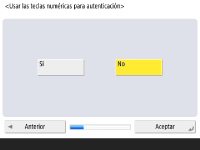 Para aumentar la seguridad del equipo, utilícelo en un sistema que emplee autenticación de usuario. ![]() Este equipo está configurado para emplear la autenticación de usuario como servicio de inicio de sesión. Para obtener más información, consulte Configuración de las opciones de administración de autenticación personal. ![]() Pulse <Sí> para <Usar autenticación de usuario>, pulse <Sí> para el método de inicio de sesión que se va a utilizar y pulse <Siguiente>. Si no emplea la autenticación de usuario, pulse <No> para <Usar autenticación de usuario>, pulse <Aceptar> y continúe al Paso 5. ![]() Indique las opciones siguientes si no hay administradores aparte del usuario "Administrador" registrado en el equipo. ![]() Si desea mejorar la seguridad del equipo deshabilitando el usuario "Administrador" y registrando un nuevo administrador, pulse <Sí>. En Registrar Administrator, introduzca <Nombre de usuario> y <Contraseña>, y pulse <Aceptar>. Especifique <Dirección de e-mail>, <ID dpto.> y <Mostrar nombre> según sea necesario. Para obtener más información, consulte Registro de la información de usuario en el dispositivo local. El usuario "Administrador" estará desactivado la próxima vez que inicie sesión. Para actuar como "Administrador", pulse <No>. ![]() ![]() Seleccione el momento en que desea mostrar la pantalla de inicio de sesión. Si selecciona <Mostrar si selecciona func.>, pulse <Funciones>, seleccione la función de la que desea mostrar la pantalla de inicio de sesión y pulse <Bien>. Seleccione también los elementos de configuración de la pantalla <Configuración> de los que desea que se muestre la pantalla de inicio de sesión. Si selecciona <No> para <Autenticación mediante teclado>, pulse <Aceptar>. Diríjase al paso 5. Si selecciona <Sí> para <Autenticación mediante teclado>, pulse <Siguiente>. ![]() ![]() Para utilizar la autenticación a través de la entrada mediante solo teclas numéricas, pulse <Sí> y <Aceptar>. | |