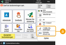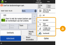 Het aantal instellingen op het scherm met basisfuncties en de plaats waar ze worden weergegeven, kan verschillen afhankelijk van hun functies. Er wordt geen sneltoets weergegeven als <Niet-toegewezen> is ingesteld als een sneltoets. De limiet voor het aantal sneltoetsen voor <Opties> dat u kunt registreren is als volgt. Kopiëren: 5 Fax: 4 Scannen en verzenden: 2 |