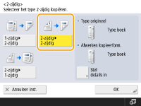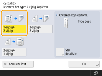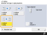 ![]() | U kunt enkelzijdige originelen afdrukken op beide zijden van het papier. U kunt ook een dubbelzijdig origineel op beide zijden van het papier kopiëren, of op twee afzonderlijke pagina's. 1-Zijdig kopiëren naar 2-zijdig 2-Zijdig kopiëren naar 2-zijdig 2-Zijdig kopiëren naar 1-zijdig |