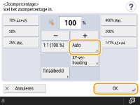 Bij het kopiëren van gelijke zoompercentages op papier met hetzelfde formaat als het origineel kunnen de randen van de gekopieerde afbeelding enigszins wegvallen. Als u dit wilt voorkomen, verkleint u de afbeelding door op <Zoompercentage> <Totaalbeeld> te drukken om de ontbrekende randen van de afbeelding er wel op te krijgen.Als u <Totaalbeeld> selecteert, wordt <Beeldverschuiving> automatisch op <Midden> ingesteld. U kunt de Auto-instelling op het scherm Zoompercentage niet gebruiken wanneer u zeer doorzichtige originelen, zoals transparanten, wilt scannen. Gebruik in plaats daarvan de vaste schaalinstelling of zoom met percentage-modus. Indien u <Auto> instelt, dient u handmatig een papierformaat te selecteren. Als u geen papierformaat selecteert, dan wordt het zoompercentage automatisch ingesteld op het formaat van het papier dat zich in papierlade 1 bevindt. |