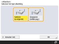 ![]() | Bij het kopiëren van twee kopieën of meer vanuit de aanvoer kunt u sorteren of groeperen selecteren voor de volgorde van de afdrukken. Selecteer "Sorteren" om op volgorde af te drukken. Selecteer "Groeperen" om bundels van elke pagina af te drukken. Dus 10 vellen van de eerste pagina, 10 vellen van de tweede, enzovoorts. |