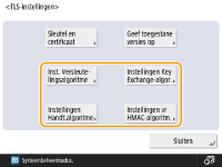 Als u een sleutel en certificaat wilt gebruiken die u zelf hebt gegenereerd, moet u sleutel en certificaat genereren voordat u onderstaande procedure uitvoert. Sleutel en certificaat voor netwerkcommunicatie genereren Als u een sleutel en certificaat wilt gebruiken die u ophaalt bij een certificeringsinstantie, moet u eerst sleutel en certificaat registreren voordat u onderstaande procedure uitvoert. Een sleutel en certificaat registreren Als u <Stel de encryptiemethode in op FIPS 140> instelt op <Aan>, kunt u ervoor zorgen dat de TLS-communicatieversleutelingsmethode voldoet aan de door de Amerikaanse overheid goedgekeurde FIPS (Federal Information Processing Standards) 140. <Stel de encryptiemethode in op FIPS 140> Als de TLS-versie is ingesteld op <TLS 1.0> of <TLS 1.1> en <Stel de encryptiemethode in op FIPS 140> is ingesteld op <Aan>, schakelt de TLS-versie naar <TLS 1.2>. Als <Stel de encryptiemethode in op FIPS 140> is ingesteld op <Aan> en de TLS-versie is ingesteld op <TLS 1.0> of <TLS 1.1>, schakelt <Stel de encryptiemethode in op FIPS 140> naar <Uit>. Als <Stel de encryptiemethode in op FIPS 140> is ingesteld op <Aan>, treedt er een fout op wanneer u probeert een certificaat voor TLS op te geven dat gebruikmaakt van een algoritme dat niet wordt herkend door FIPS (minder dan RSA 2048-bits). Er treedt een communicatiefout op als u <Stel de encryptiemethode in op FIPS 140> instelt op <Aan> en verzendt naar een andere partij die geen ondersteuning biedt voor door FIPS herkende versleutelingsalgoritmen. Als <Stel de encryptiemethode in op FIPS 140> is ingesteld op <Aan>, <CHACHA20-POLY1305>, <3DES-CBC> en <X25519> schakel over naar <Uit>. Als <CHACHA20-POLY1305> <3DES-CBC>, of <X25519> is ingesteld op <Aan>, schakelt <Stel de encryptiemethode in op FIPS 140> over naar <Uit>. |