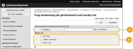Het resultaat van het verzenden van de e-mail kan worden gecontroleerd in [Status monitor/Annuleren] in [Opdrachtlog]. Deze bewerking kan alleen worden uitgevoerd door een gebruiker met de vereiste bevoegdheden. Deze instelling kan alleen worden geïmporteerd van/geëxporteerd naar dezelfde serie machines. De gegevens van instellingen importeren/exporteren Deze instelling is opgenomen in [Basisinformatie instellingen/registratie] bij het exporteren van batches. Alle instellingen importeren/exporteren |