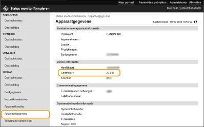 Voorbereiden op het bijwerken van firmwareDownload de nieuwste firmware van de Canon-website (https://global.canon/). Maak een reservekopie van de machinegegevens en -instellingen voor het geval de firmware-update niet goed wordt uitgevoerd. Opmerking over het updateprocesHet apparaat start meerdere keren opnieuw op. Het updateproces wordt onderbroken als er taken overblijven. Het scherm schakelt meerdere keren over tijdens het updateproces. Het kan even duren voordat het scherm overschakelt, maar sluit de browser pas af als het updateproces is voltooid. |