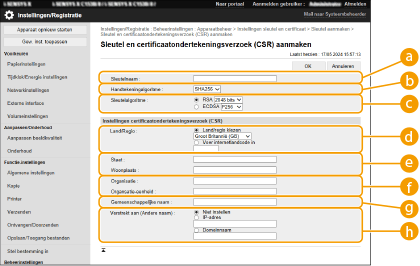 Certificaten die op deze machine worden gegenereerd, hebben geen CA-handtekening, waardoor communicatiefouten met sommige communicatie-evenknieën kunnen optreden. Om een certificaat met een CA-handtekening aan te vragen, zijn gegevens voor een certificaatondertekeningsverzoek (CSR) nodig. Een gebruiker die zich aanmeldt met beheerdersbevoegdheden, kan een CSR genereren.